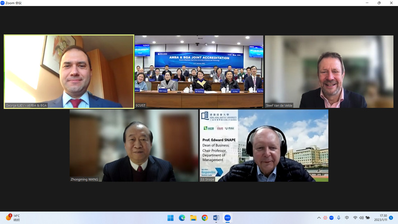 今年1月9日至11日,由AMBA和BGA国际认证咨询委员会主席Steefvan de Velde教授、香港浸会大学商学院院长Edward Snape教授、浙江大学全球创业研究中心主任王重鸣教授、AMBA和BGA认证总监George Iliev先生组成的AMBA和BGA国际认证专家组对华东理工大学商学院开展了为期三天的线上认证评估。校党委书记杜慧芳,副校长李剑,党委办公室主任侯宇,研究生院院长杜文莉,教务处处长黄婕,国际教育学院院长李霄鹏,商学院党委书记侯丽敏、院长马铁驹,以及商学院党政班子成员和相关部门负责人出席了认证会谈。